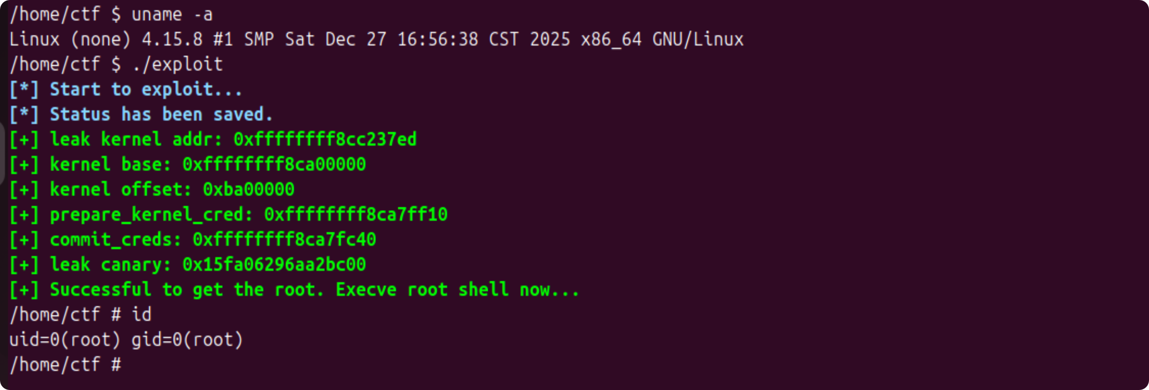 笔者测试的内核版本是 Linux (none) 4.15.8 #1 SMP Sat Dec 27 16:56:38 CST 2025 x86_64 GNU/Linux。